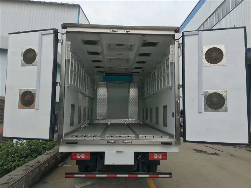 【豬苗車】上裝配置:外玻璃鋼,內(nèi)不銹鋼,兩層液壓升降層板,尾部液壓翻轉上豬平臺,層板為不銹鋼骨架鋪鋁花紋板。外部電動升降窗,排氣扇,柴油發(fā)電機,暖風加熱,喂水系統(tǒng),凈水箱、污水箱,箱內(nèi)攝像頭監(jiān)控,倒車影像,凱利制冷機組。(油暖加熱為選裝部件)