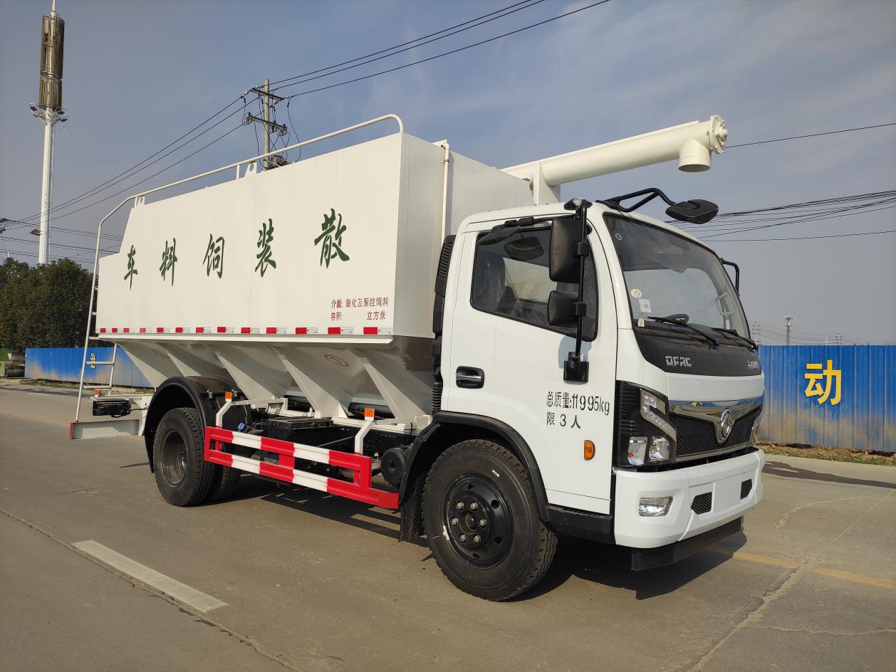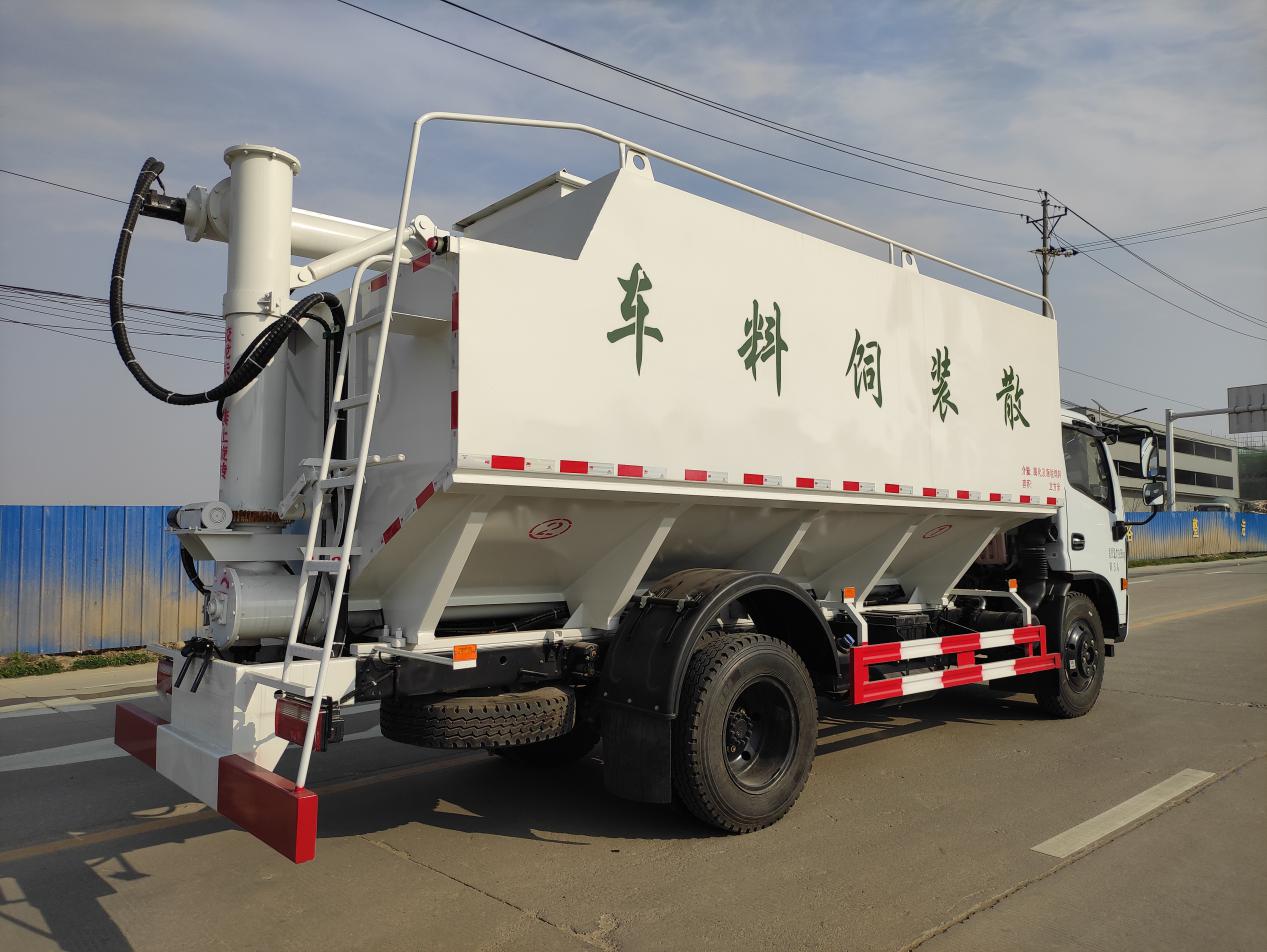 散裝飼料運輸車,散裝飼料車的飼料罐架設在卡車的底盤上,罐頂開有進料口.頂部的一根螺旋輸送卸料管(俗稱卸料絞龍)則可自由回轉和抬升,抬升的仰角可達60度。運輸時,頂部的螺旋管平臥在罐頂;卸料時則抬起,使管端的出料口與畜禽飼養(yǎng)場貯料罐頂部的進料門相接,駕駛室內(nèi)裝有操縱裝置(操縱裝置也可裝置在罐體尾部),卸料時通過車底的動力輸出軸和減速器來驅動螺旋,以完成卸料。